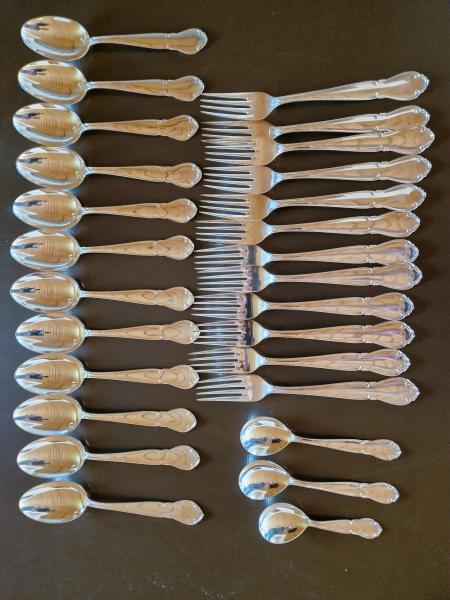 Meget flot, fremstår som ubrugt. 12 gafler, 12 skeer, 3 andre skeer.