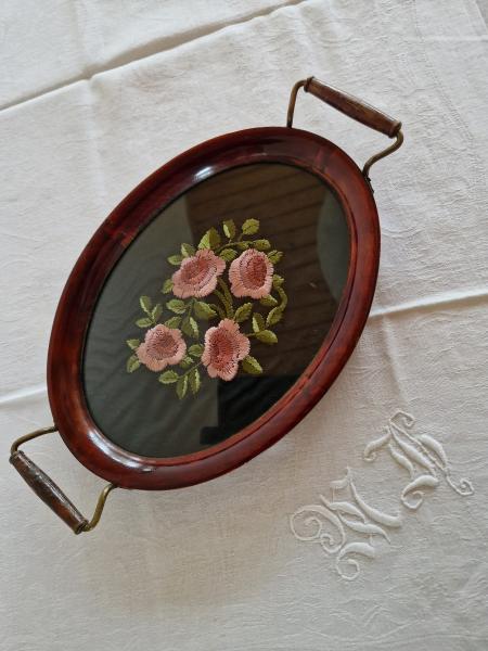Antik bakke med glasbund. Meget smuk i mahogniramme med håndtag.