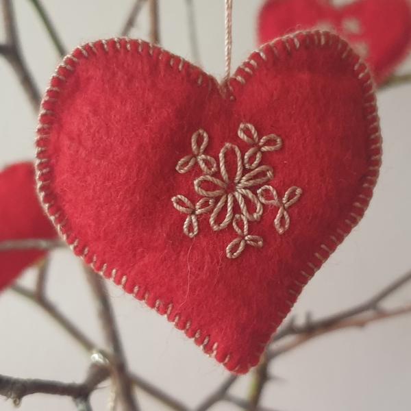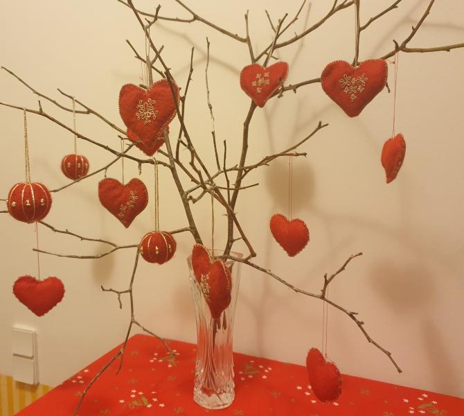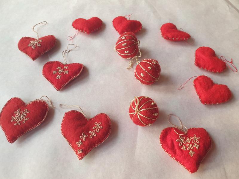 Til ophæng: 10 røde filthjerter og 3 røde filtkugler