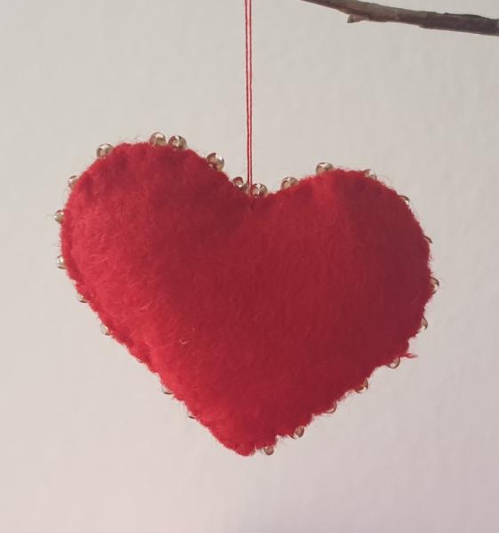 5 af hjerterne – 5 cm bredde, har klare perler syet på hele vejen rundt i kanten – de har røde ophæng.